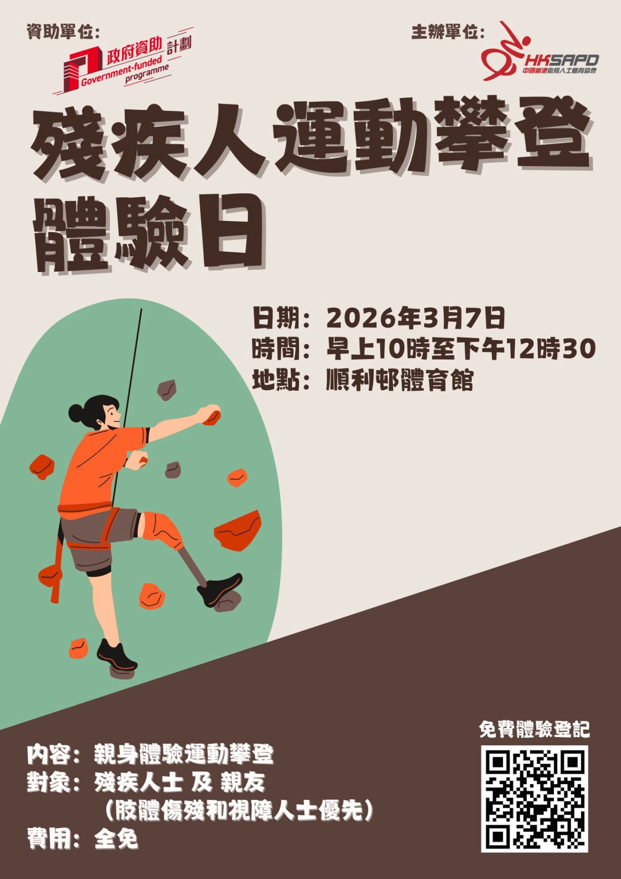協會將於 3月7日(星期六)舉辦殘疾人運動攀登體驗日,讓大家親身體驗攀爬的樂趣及成就感。無論是肢體傷殘或視障人士,都歡迎與親友一同參加,共享精彩時刻。