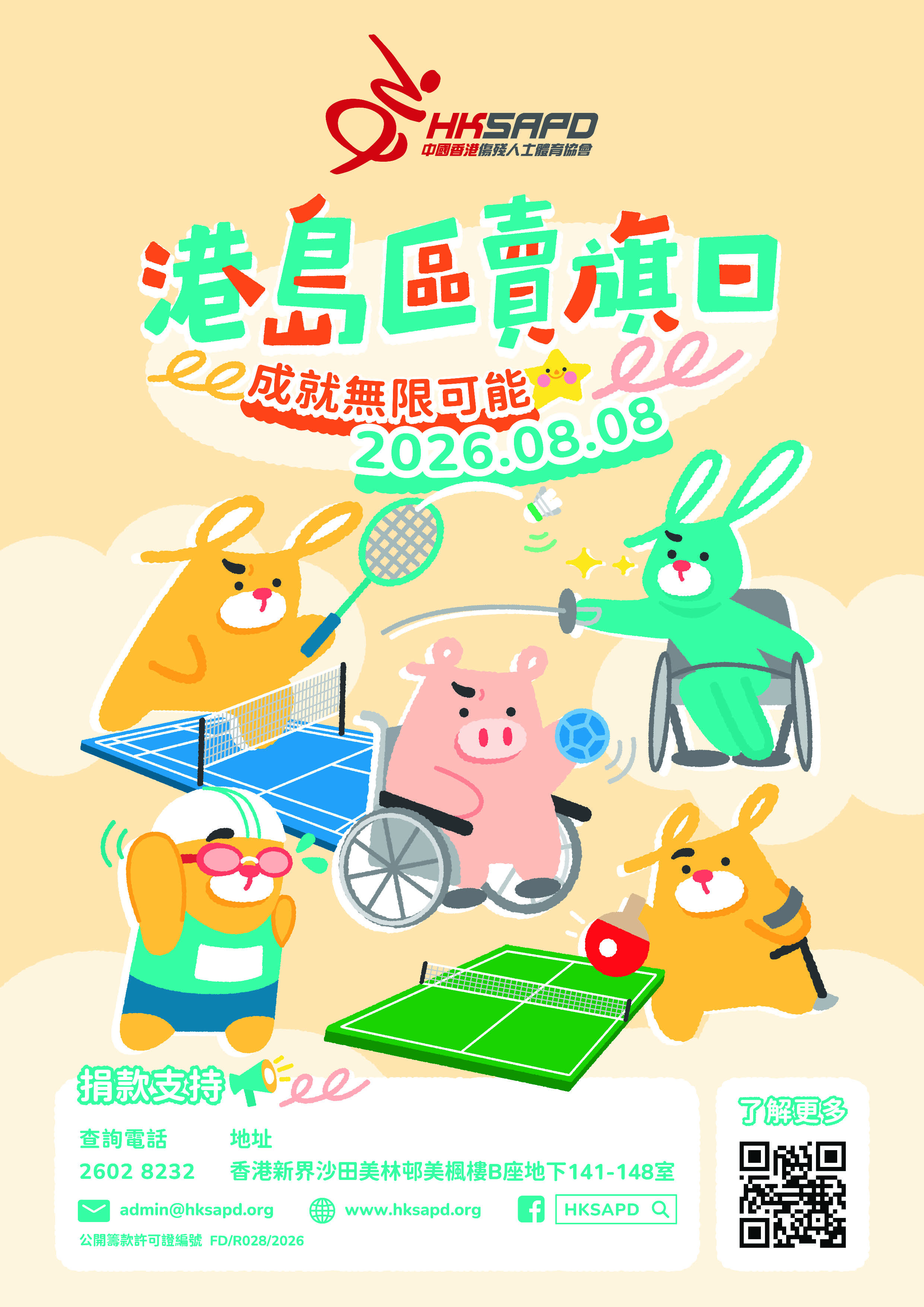 透過系統化的訓練和比賽,傷殘運動員不斷突破自我,在本地及國際賽事中取得優異成績,「成就無限可能」。協會將於2026年8月8日(星期六)舉行港島區賣旗日,誠邀各界支持,為推廣本地殘疾人體育運動籌募善款。如有任何查詢,請致電 2602 8232 與秘書處傳訊及公共事務職員聯絡。