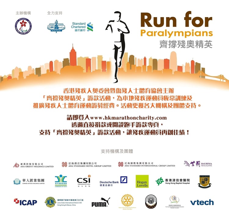 渣打香港馬拉松自1997年舉行已來,一直全力支持香港殘疾人奧委會暨傷殘人士體育協會(協會),推動本地殘疾人士運動發展。協會繼續獲得香港業餘田徑總會及渣打銀行的鼎力支持,於2月12日舉辦「齊撐殘奧精英2017」籌款活動,為運動員的恆常訓練及推廣殘疾人士體育運動籌募經費。多個機構及團體將參與渣打香港馬拉松十公里及半馬拉松賽事,身體力行支持香港殘疾運動員再創佳績!