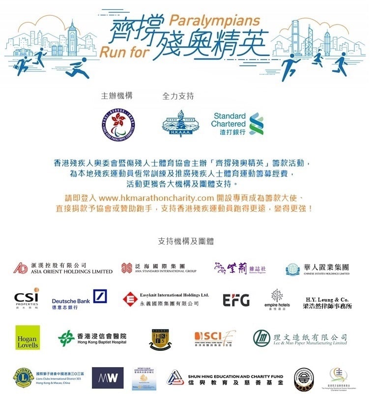 渣打香港馬拉松自1997年舉辦以來,一直全力支持協會推動本地殘疾人運動發展,培育運動員提升競技水平及締造體育成就。今年協會繼續獲得渣打銀行及香港業餘田徑總會的鼎力支持,於1月21日舉辦「齊撐殘奧精英」籌款活動,為運動員的恆常訓練及推廣殘疾人士體育運動籌募經費。多個機構及團體將參與渣打香港馬拉松十公里、半馬拉松及馬拉松賽事,身體力行支持香港殘疾運動員再創佳績!